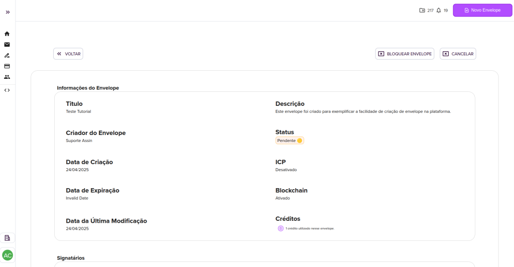 It may happen that, after sending an envelope for signature, even if some of the signers have already signed, you no longer want it to be signed. In Assin, it is possible to cancel an envelope. But be aware, this is only possible before all signers have signed, that is, if it has a “pending” status. After everyone has signed, the final signed version will be generated and no further modifications can be made to the envelope.